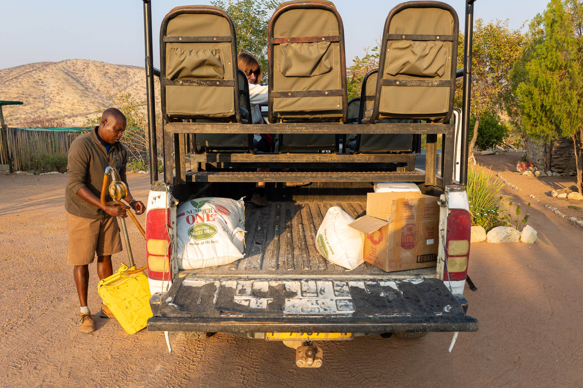 Mein Koffer kommt in einen schwarzen Müllsack und auf die staubige Pickupfläche, damit der gute Mann hinten sitzen kann. Im Gespräch kommt raus, dass er oft so fährt, er ist für Landscape zuständig und räumt auf, sie haben aber nicht genügend Fahrzeuge und Zeit, also muss einer hin und wieder als Anhalter mitfahren. Goas entfällt deshalb für uns. Mein Koffer wird wohl stark einstauben, aber wir bekommen eine für uns wertvolle Information. Im ganzen Park gibt es keinen Sprit. ☹☹
