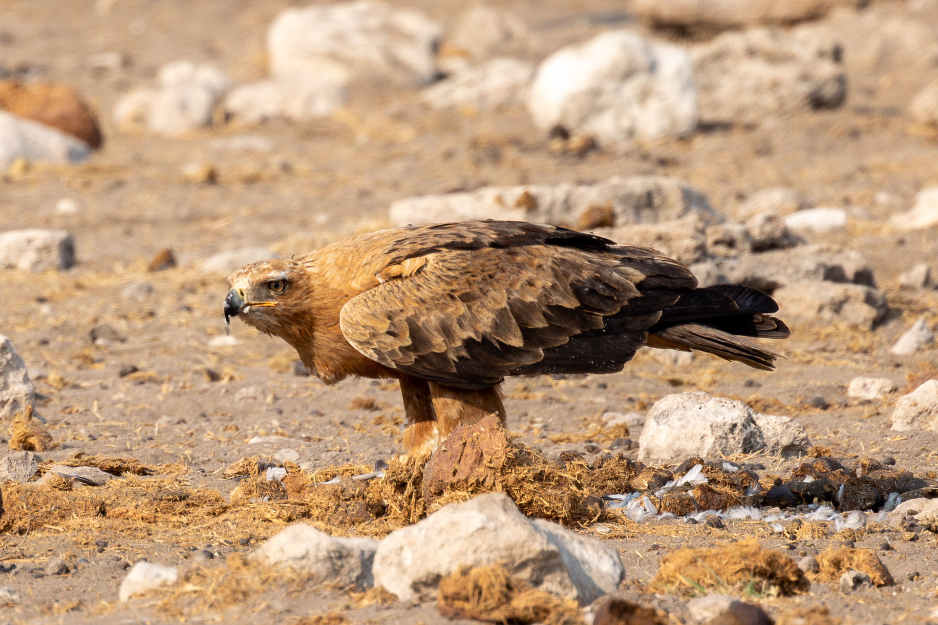 Nach Klein Namutoni und Chudob, wo wir den Adler wieder treffen, fahren wir nach Kalkheuvel. Die Straße besteht fast nur aus Schlaglöchern und wir brauchen deutlich mehr Zeit, da wir fast nur Schritttempo fahren können. Trotzdem werden wir richtig durchgerüttelt.