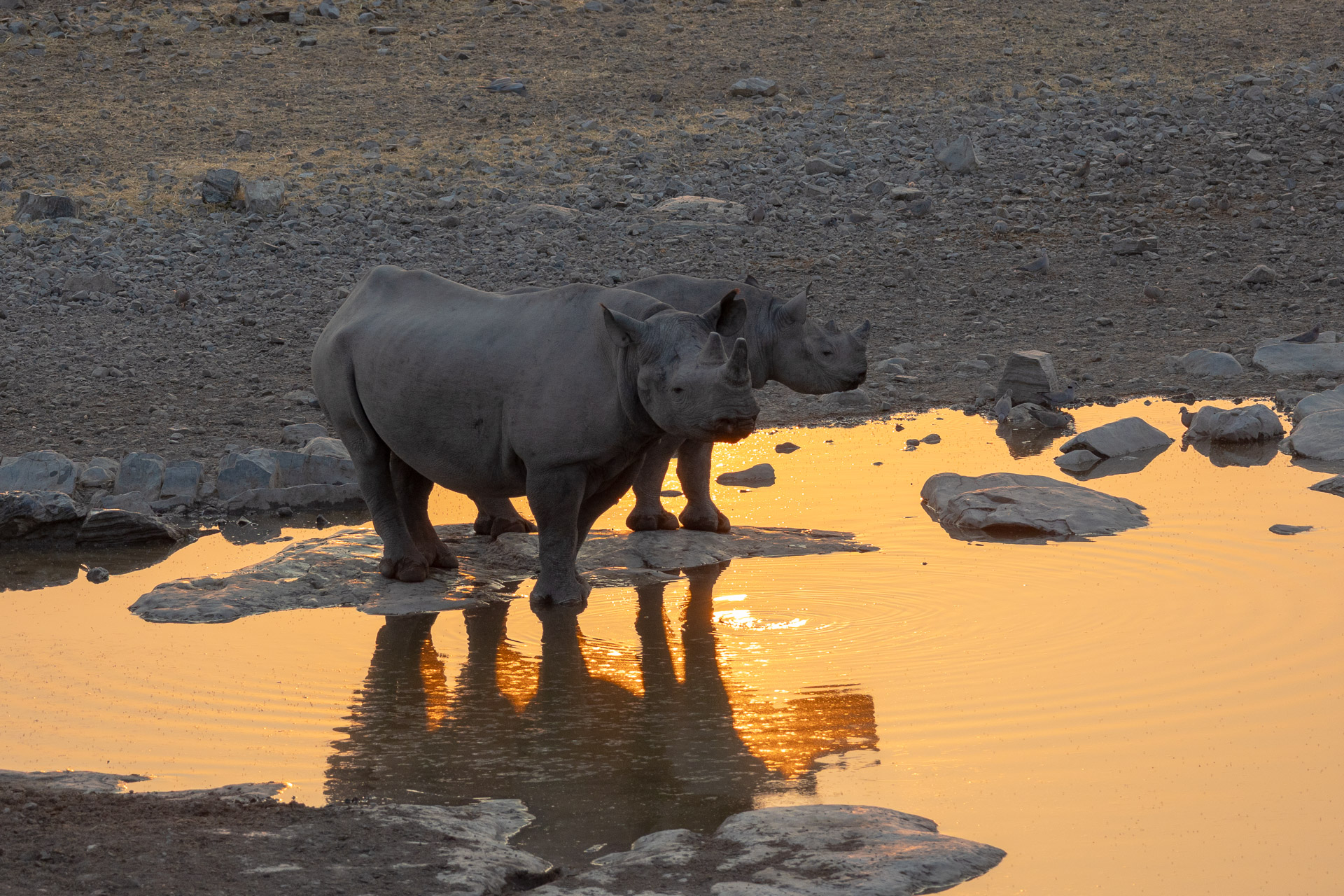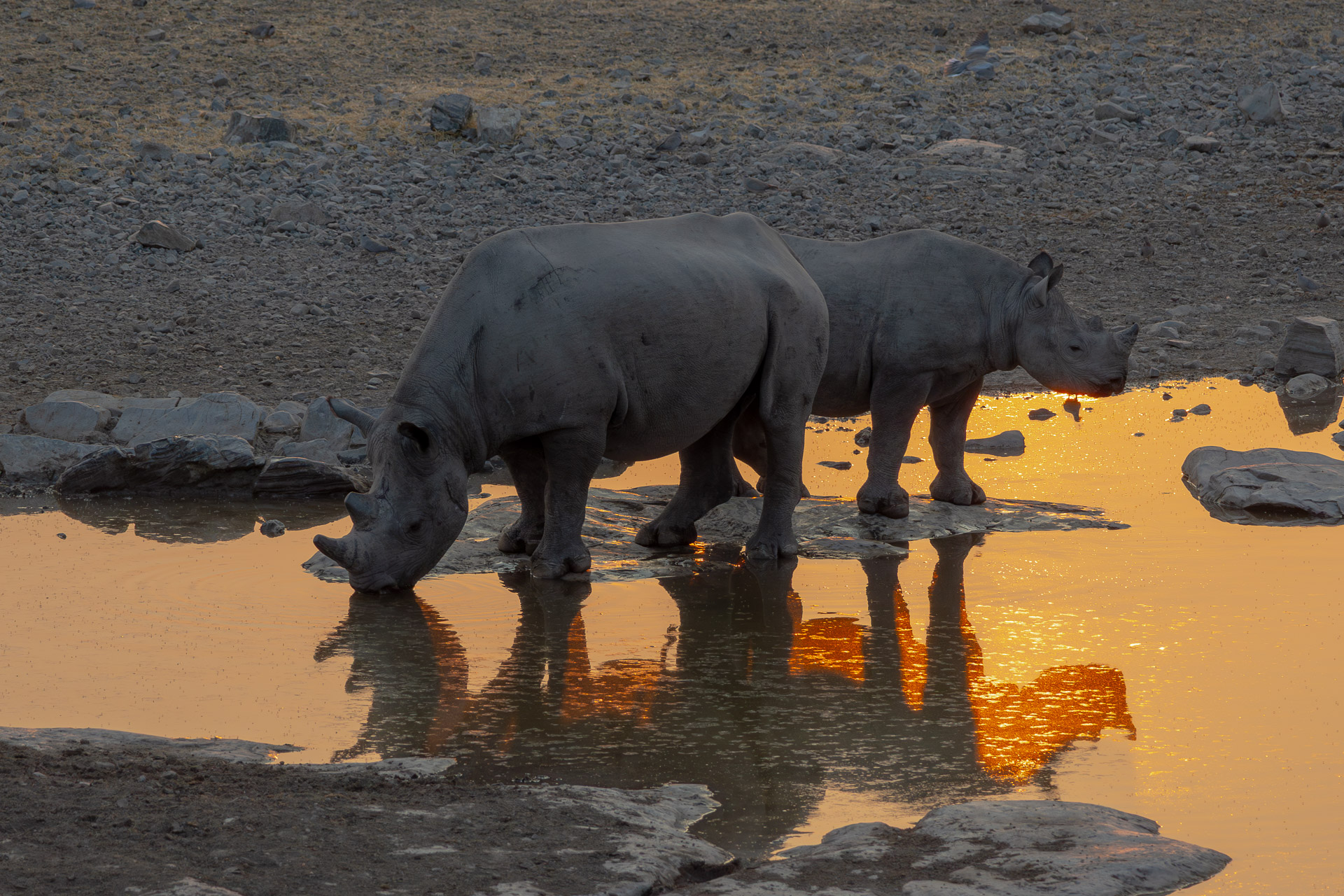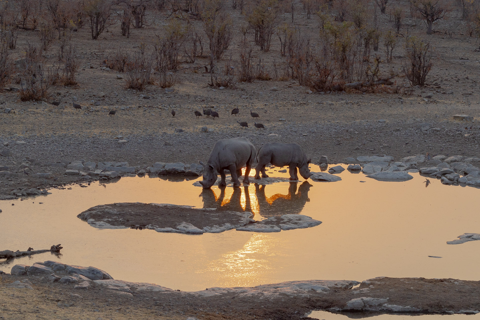 18:10 Uhr, es raschelt und dann kommen tatsächlich 2 Nashörner aus dem Busch, später noch ein kleineres drittes. Alles schweigt und staunt, da hat uns Halali nun doch noch etwas versöhnt – fantastischer View. Sonnenuntergang gab es gratis dazu.