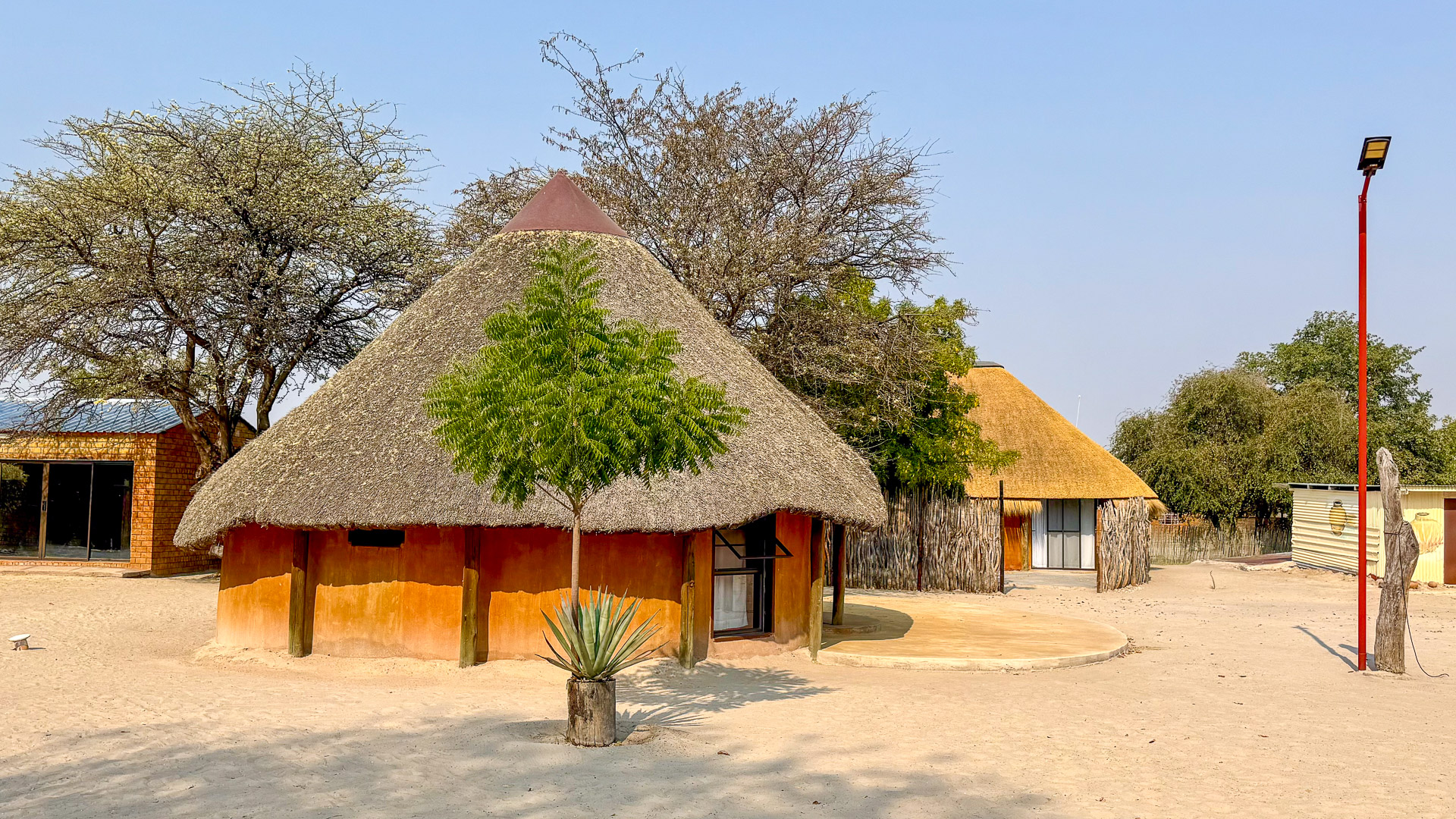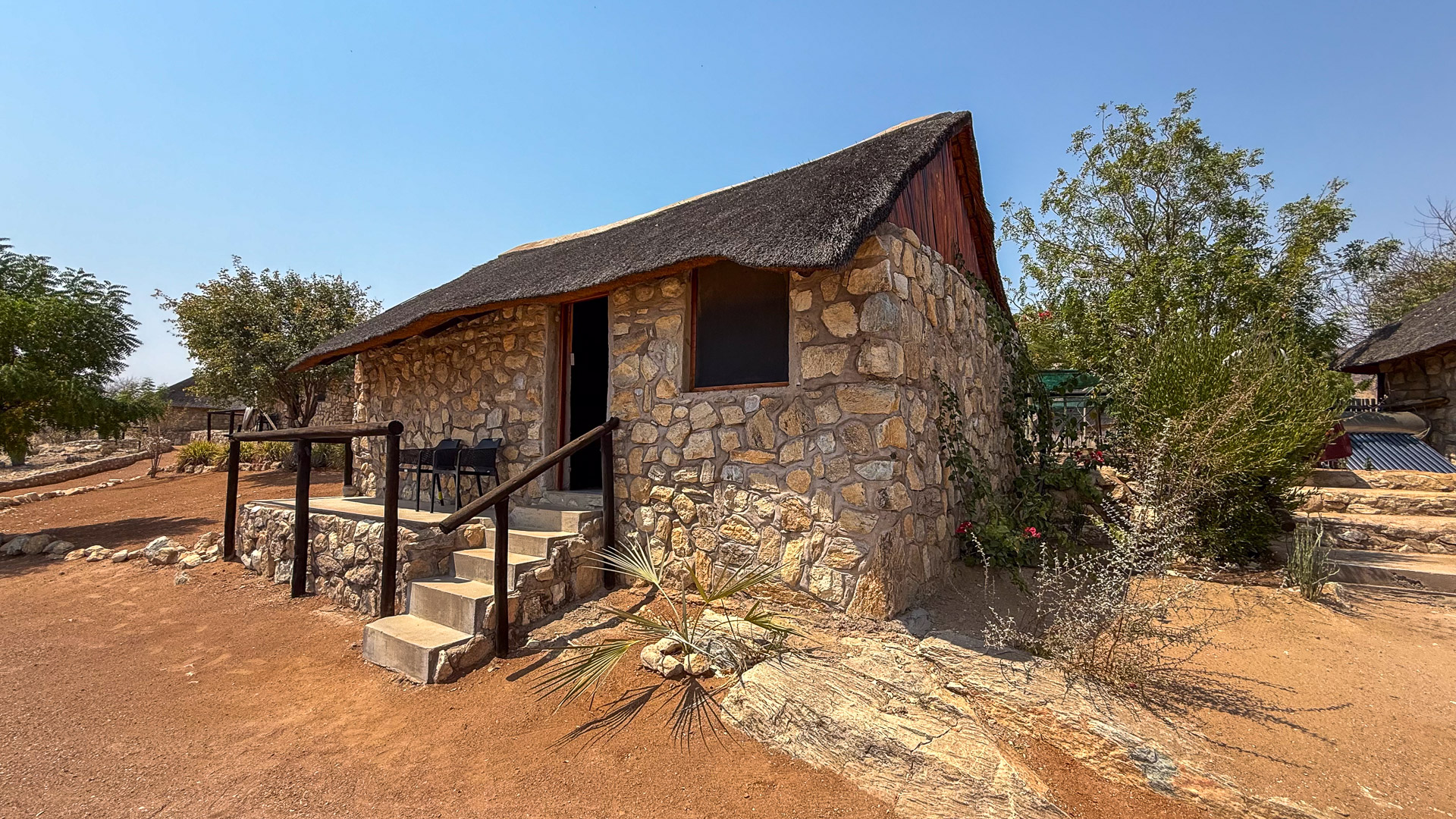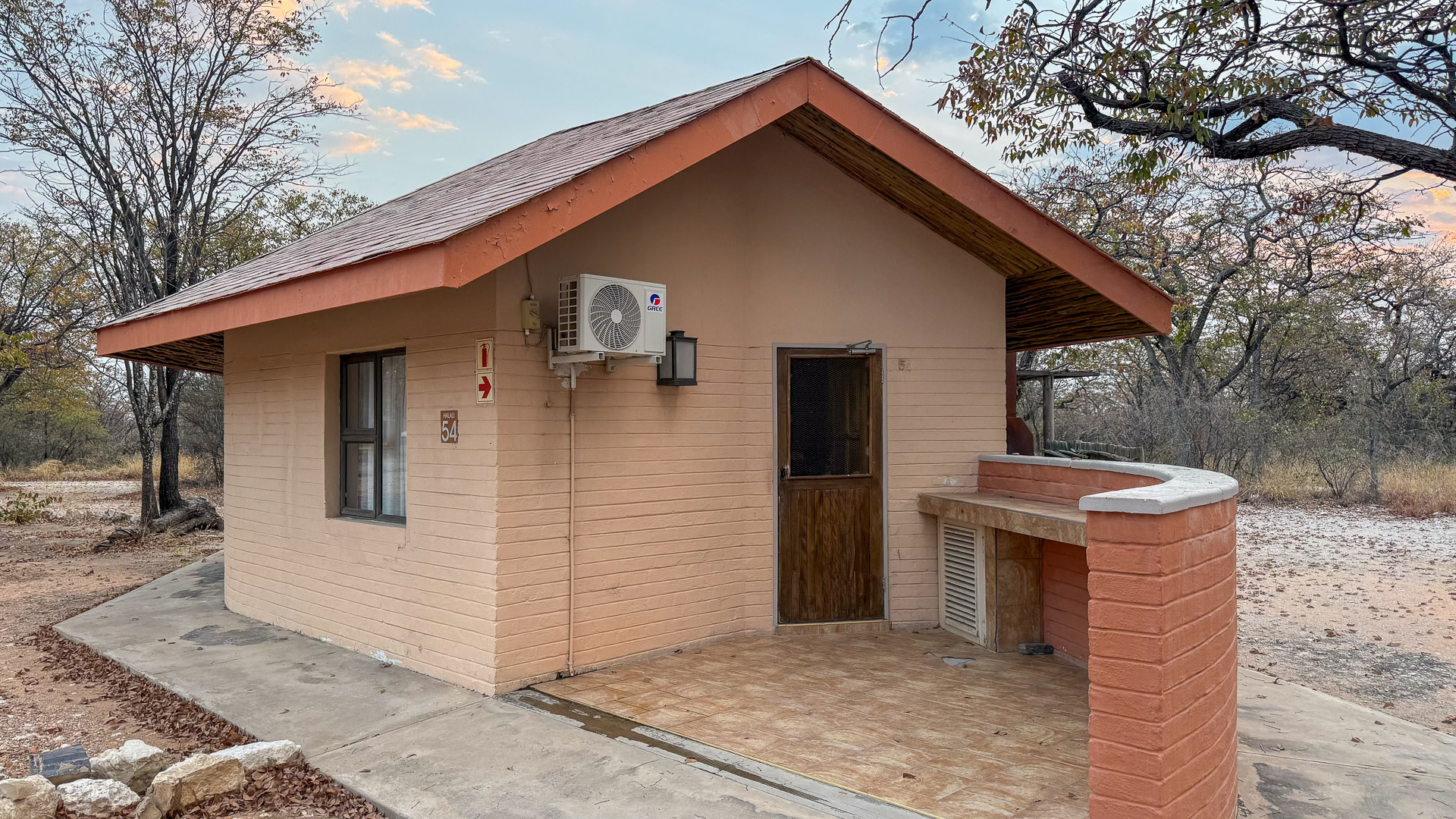 14:20 Uhr sind wir wieder an der Rezeption. Für den Schlüssel wollen sie 500 N$ Kaution, die wir nicht haben. Dann eben 50€ – das ist doppelt so viel… Bushchalet Nr. 54, ganz am Rand des Camps, gehört uns für diese Nacht.