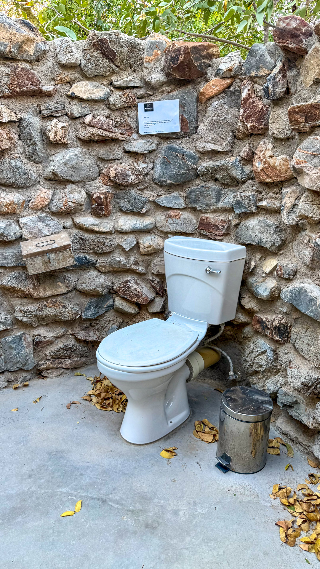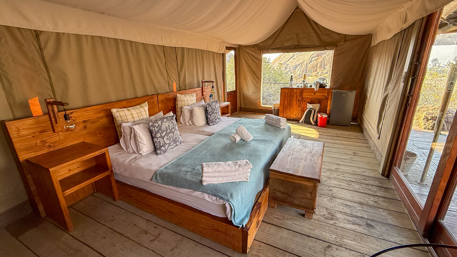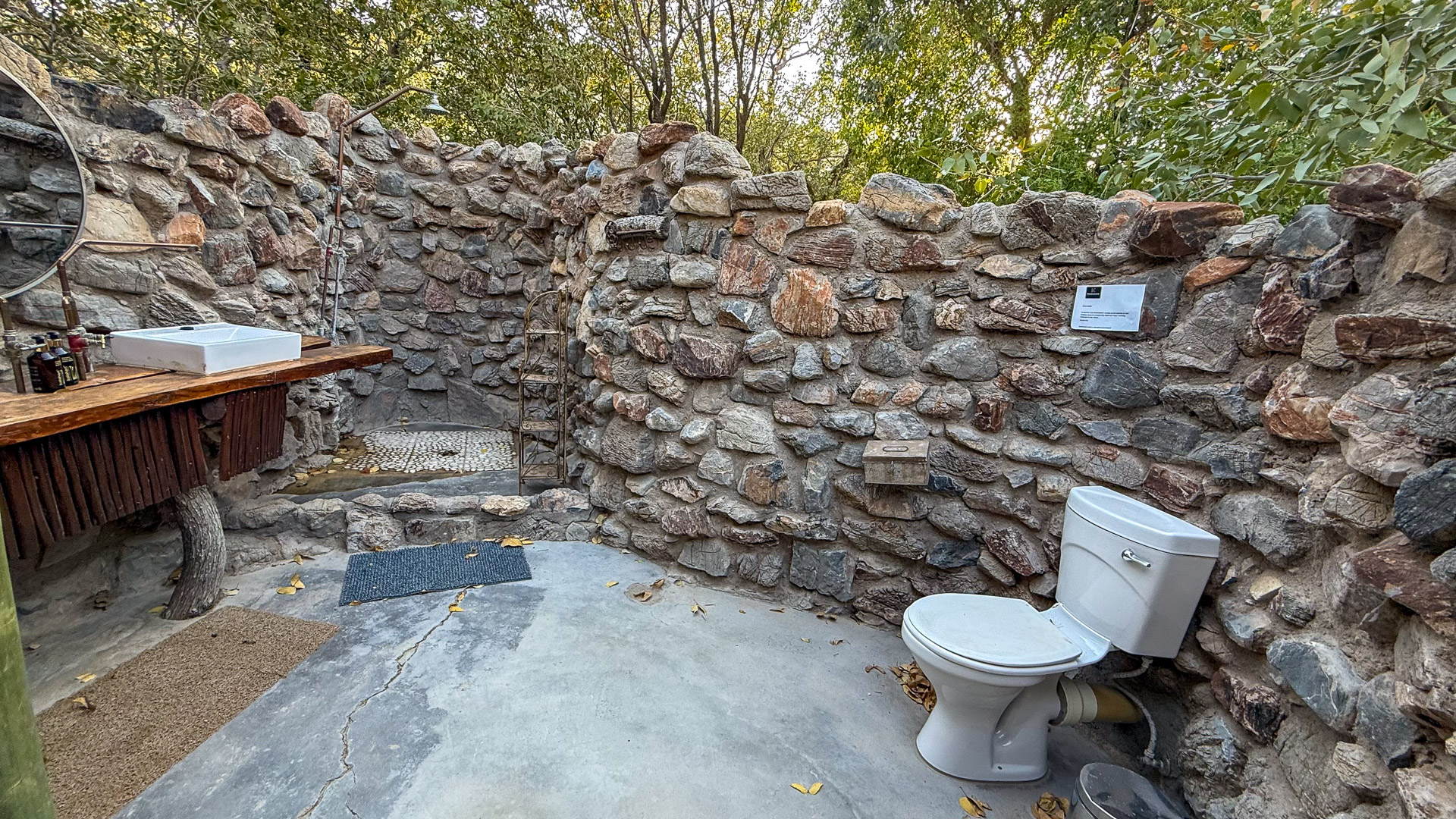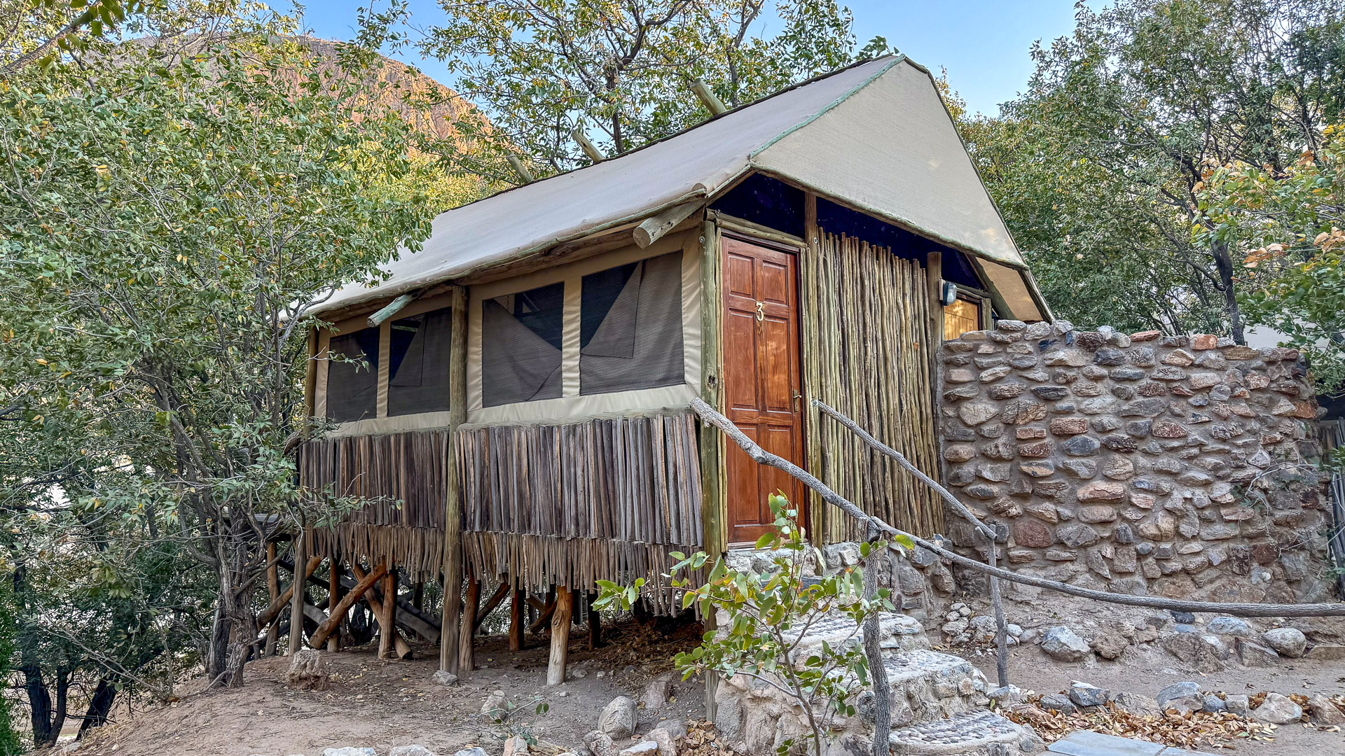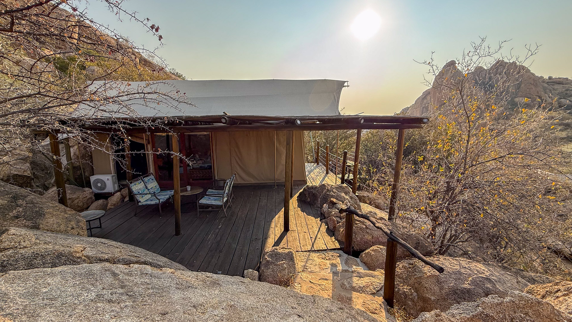 Die Zeltchalets stehen auf festen Plattformen und sind angelehnt an die Granitfelsen. Das Badezimmer ist an den Felsen gebaut. Überraschung: es gibt sowohl eine Klimaanlage (die Eingangstür besteht zur Hälfte aus Netz😊) und es gibt wifi sogar im Zelt.