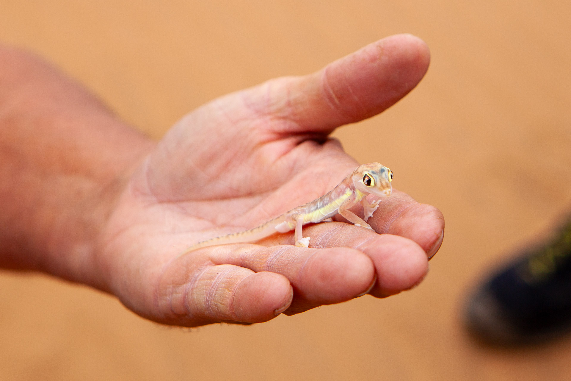 Der Namibgecko kommt nur in der Namib vor und verbringt den Tag in selbst gegrabenen Gängen. Er ist ca. 13cm lang und einige innere Organe sind sichtbar. Die Zehenzwischenräume sind mit einer „Schwimmhaut“ ausgestattet, die den Geckos ermöglicht durch lockeren Sand zu laufen, ohne einzusinken.