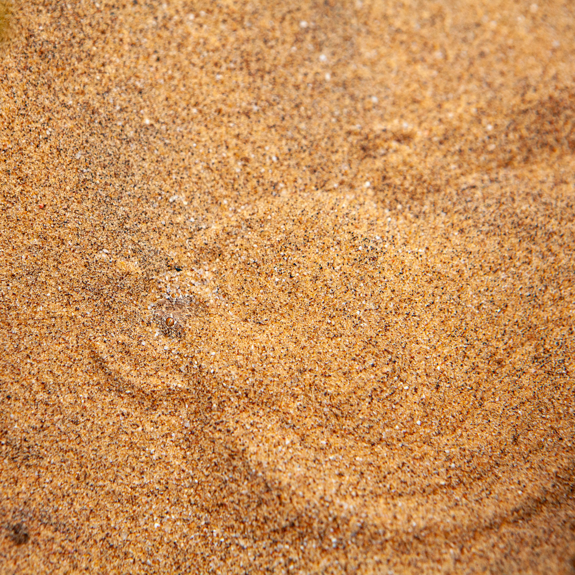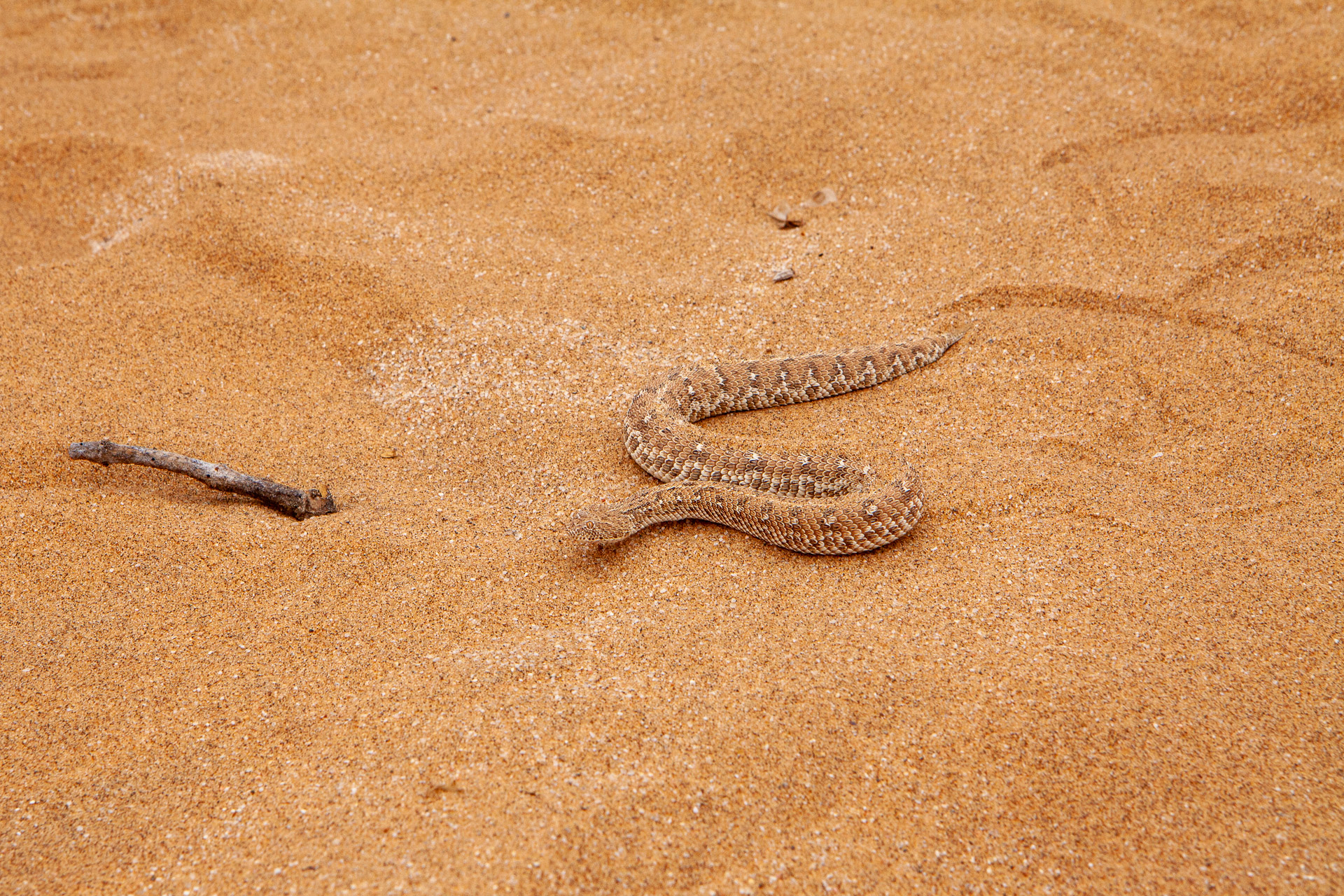 Auch die Sandviper ist typisch für die Wüstenregionen der Namib und die einzige Viper, die dort vorkommt. Sie wird bis zu 30 cm lang und bewegt sich seitwärts durch den Sand. Tagsüber liegt sie im Sand vergraben, dabei ragen Augen, Nasenöffnung und Schwanzspitze aus dem Sand (siehe Foto rechts).