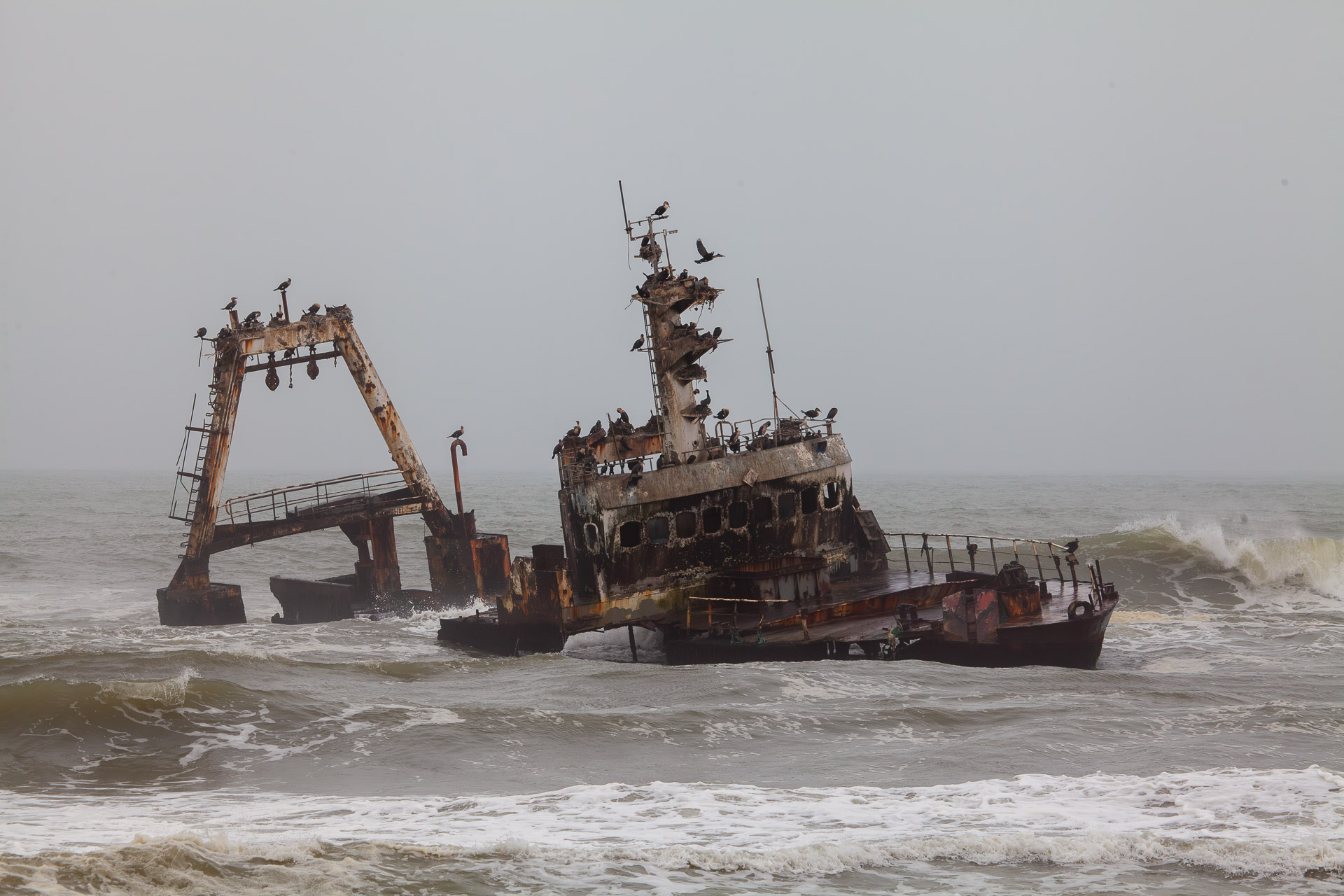 Zunächst geht es gut 75 km die asphaltierte Straße hoch bis Henties Bay, dann auf die C35 ins Landesinnere. An der Küste ist es noch ziemlich nebelig. Wir stoppen nur für ein paar Fotos des gestrandeten Schiffes Zelia und fahren zügig weiter.