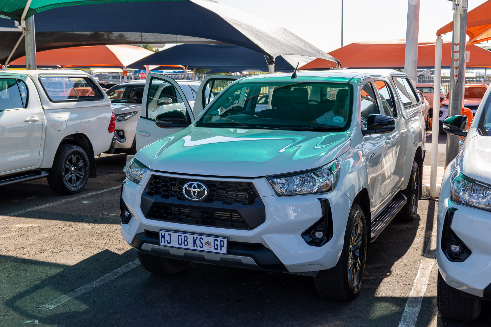 In der Wartehalle wechseln wir noch 100€ in N$ und dann holen wir den gebuchten Mietwagen, einen Toyota Hilux, bei Europcar ab.