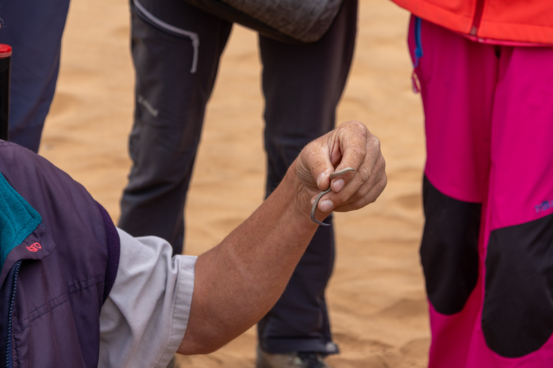 Im Anschluss fahren wir weiter in die Wüste, bekommen die Strukturen der Dünen, deren Fragilität, die Sandarten und vieles mehr erklärt. Informativ ohne langweilig zu sein. Mit jedem Schritt zerstören wir für 24 Stunden die Sandstruktur unter uns, ein Auto oder Quad bewirkt eine Zerstörung für Wochen. Jürgen bittet darum, nur im Gänsemarsch zu gehen, um so wenig wie möglich kaputt zu machen.