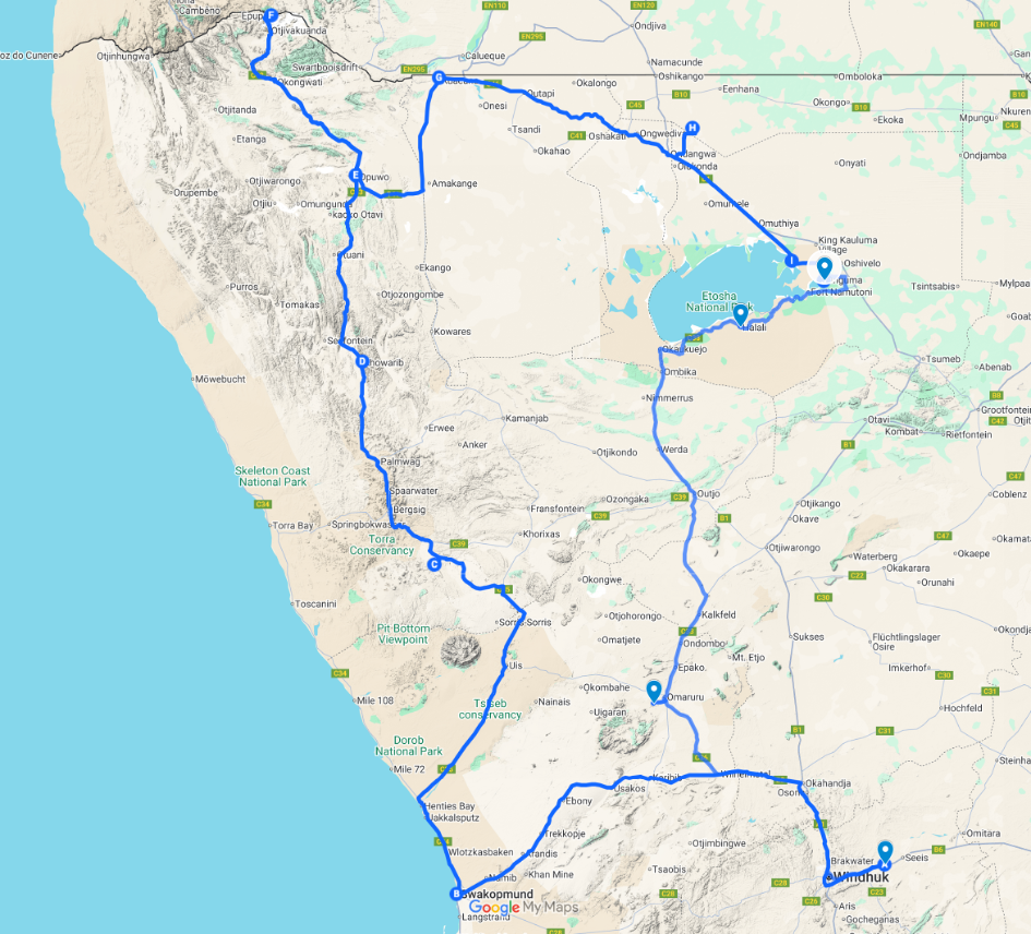 Von Windhoek ging es gleich nach der Landung weiter nach Swakopmund, von da aus in Richtung Norden mit einigen Stationen bis an die angolische Grenze (Epupa-Falls). Durch den Norden Namibias in den nördlichen und östlichen Teil der Etosha. Der Rückweg führte uns über die Touristenzentren im Süden der Pfanne zurück nach Windhoek.